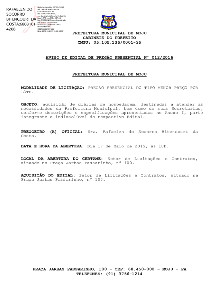 Digitally signed by RAFAELEN DOBITENCOURT DA RAFAELEN DO SOCORRO COSTA:68081014268 DN: cBR, oICPBrasil, SOCORRO ouSecretaria da Receita Federal do RFB, ouRFB eCPF A3, BITENCOURT DA Brasil ou(EM BRANCO),
