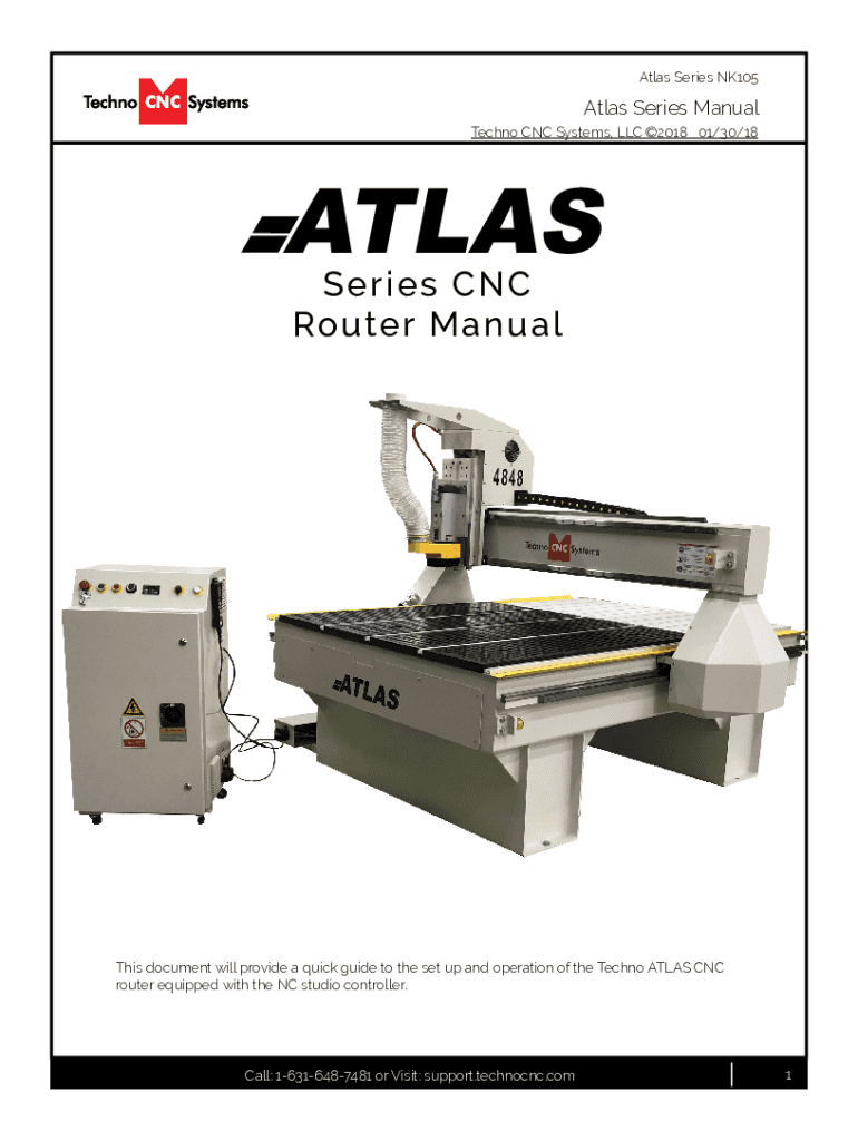 Atlas Series NK105Atlas Series Manual Techno CNC Systems, LLC 2018 01/30/18ATLAS S er i es C NC Ro u ter Ma nu a lThis document will provide a quick guide to the set up and operation of the Techno