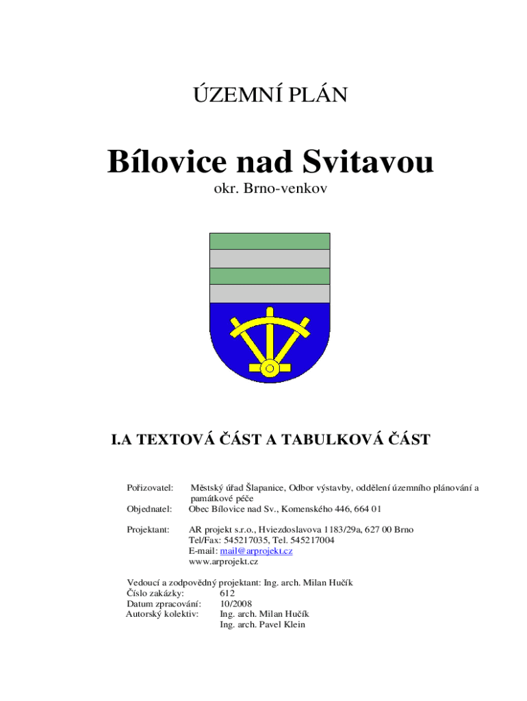 ZEMN PLNBlovice nad Svitavou okr. BrnovenkovI.A TEXTOV ST A TABULKOV ST Poizovatel: Objednatel: Projektant:Mstsk ad lapanice, Odbor vstavby, oddlen zemnho plnovn a pamtkov pe Obec Blovice nad Sv.,