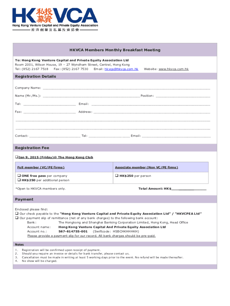 HKVCA Members Monthly Breakfast Meeting To: Hong Kong Venture Capital and Private Equity Association Ltd Room 2001, Wilson House, 19 27 Wyndham Street, Central, Hong Kong Tel: (852) 2167 7518Fax: