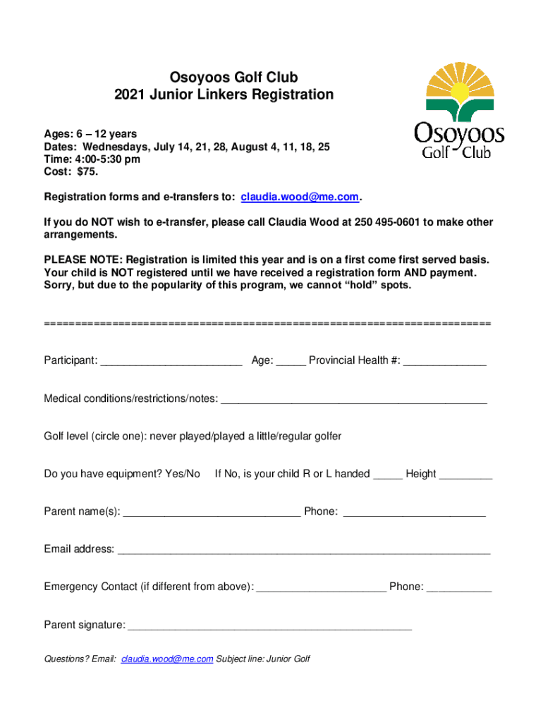 Osoyoos Golf Club 2021 Junior Linkers Registration Ages: 6 12 years Dates: Wednesdays, July 14, 21, 28, August 4, 11, 18, 25 Time: 4:005:30 pm Cost: $75. Registration forms and etransfers to: claudia.wood@me.com.