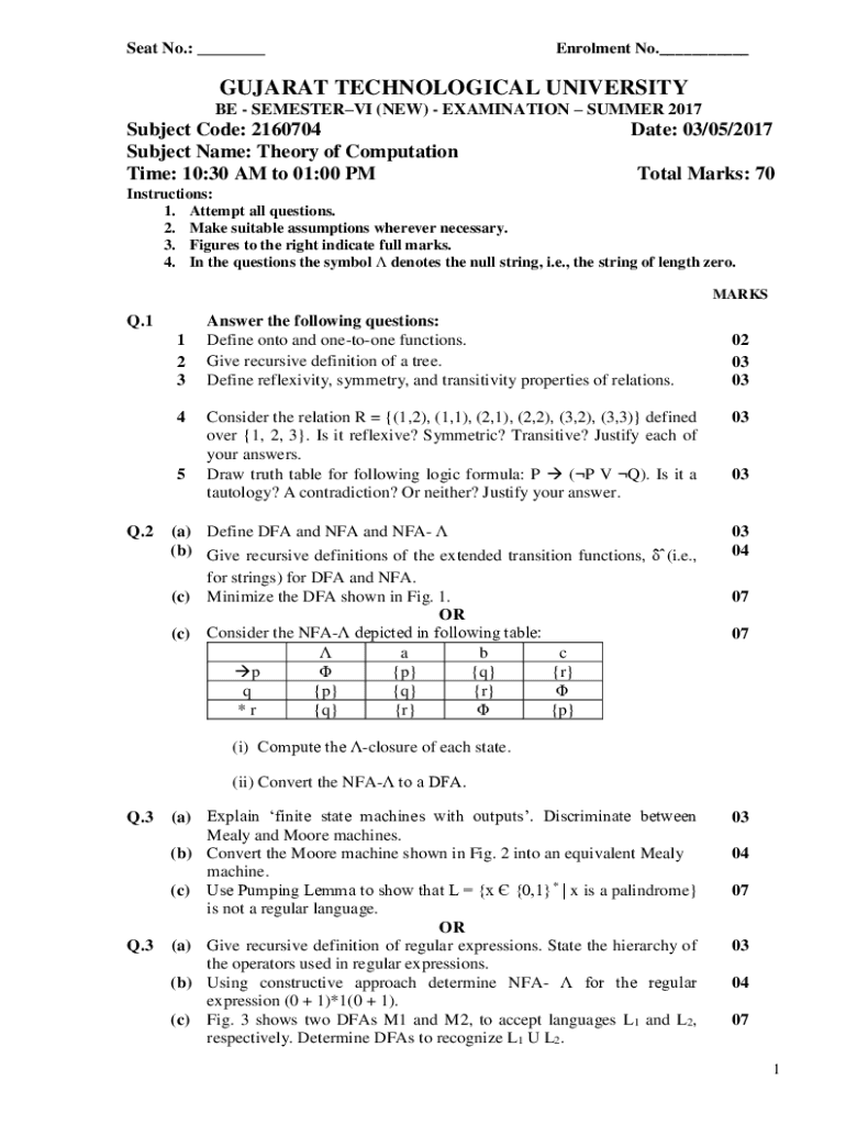 Seat No.: ___Enrolment No.___GUJARAT TECHNOLOGICAL UNIVERSITY BE SEMESTERVI (NEW) EXAMINATION SUMMER 2017Subject Code: 2160704 Subject Name: Theory of Computation Time: 10:30 AM to 01:00 PMDate: 03/05/2017