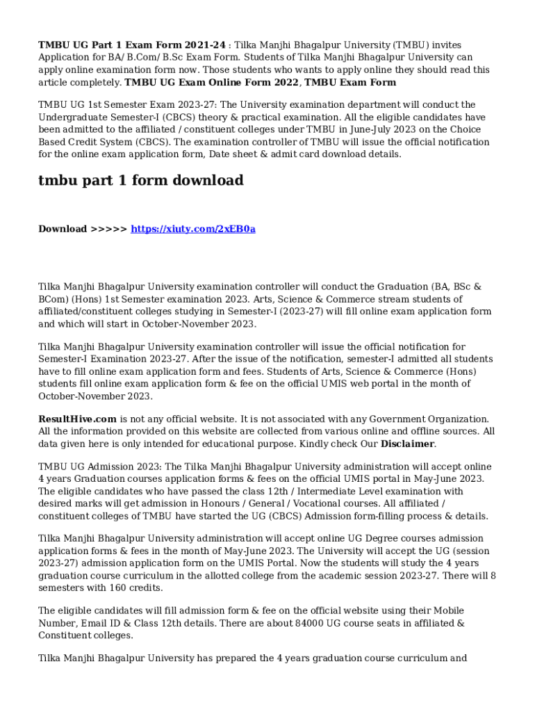 TMB UG Part 1 Exam Form 202124 : Tilda Gandhi Bhagalpur University (TMB) invites