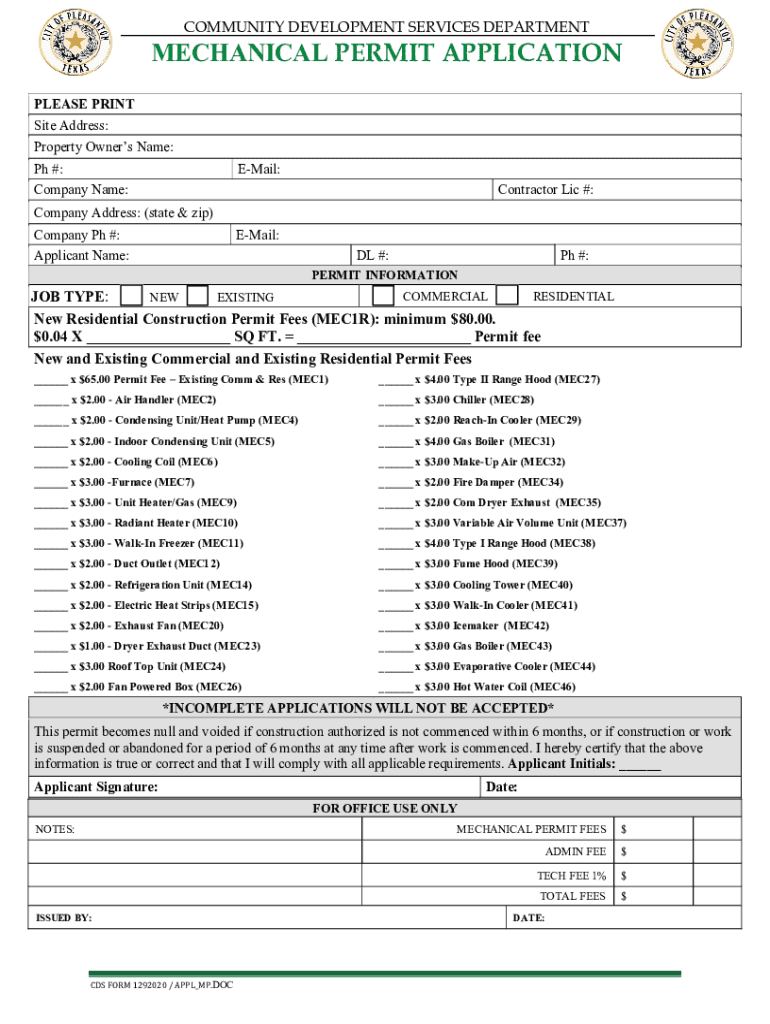 COMMUNITY DEVELOPMENT SERVICES DEPARTMENTMECHANICAL PERMIT APPLICATION PLEASE PRINT Site Address: Property Owners Name: Ph #: Company Name:EMail: Contractor Lic #:Company Address: (state & zip) Company