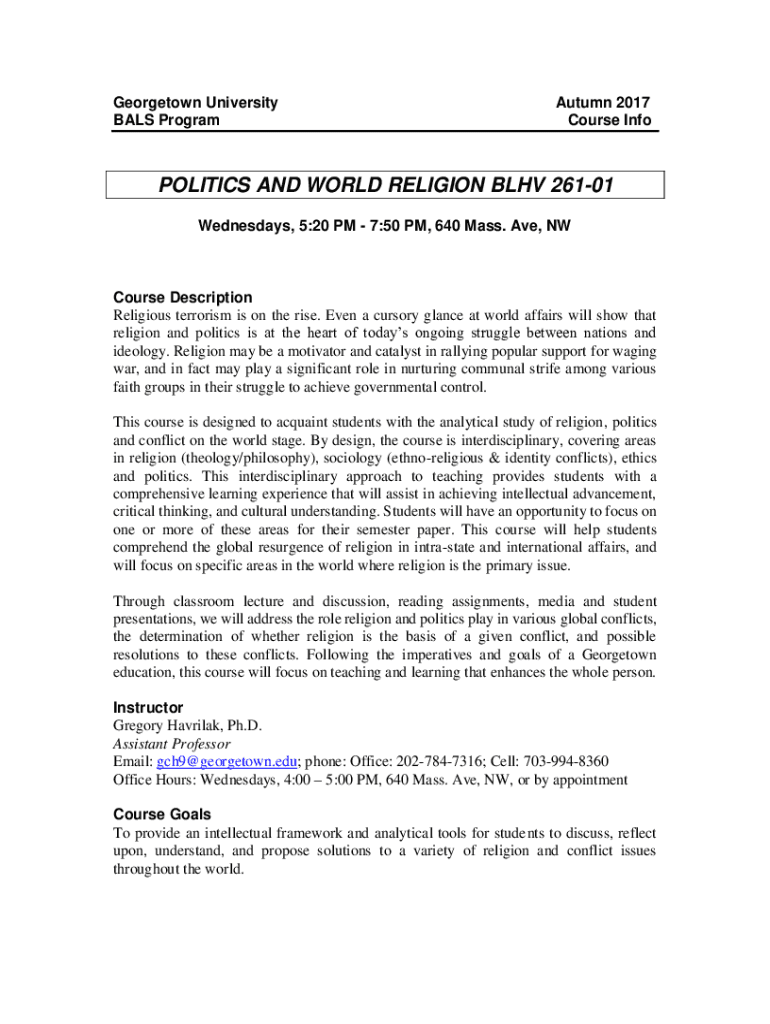 Georgetown University BALS ProgramAutumn 2017 Course InfoPOLITICS AND WORLD RELIGION BLHV 26101 Wednesdays, 5:20 PM 7:50 PM, 640 Mass. Ave, NWCourse Description Religious terrorism is on the rise.
