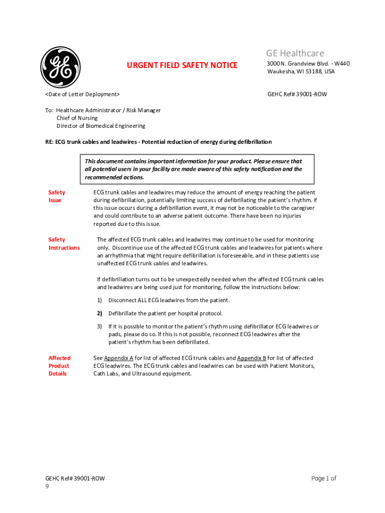 GE Healthcare URGENT FIELD SAFETY NOTICE Date of Letter Deployment3000 N. Grandview Blvd. W440 Waukesha, WI 53188, USAGEHC Ref# 39001ROWTo: Healthcare Administrator / Risk Manager Chief of Nursing