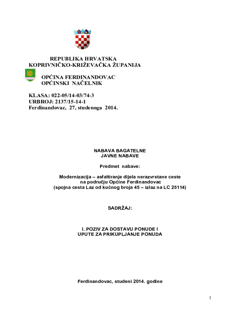 REPUBLIKA HRVATSKA KOPRIVNIKOKRIEVAKA UPANIJA OPINA FERDINANDOVAC OPINSKI NAELNIK KLASA: 02205/1403/743 URBROJ: 2137/15141 Ferdinandovac, 27, studenoga 2014.NABAVA BAGATELNE JAVNE NABAVE Predmet nabave: