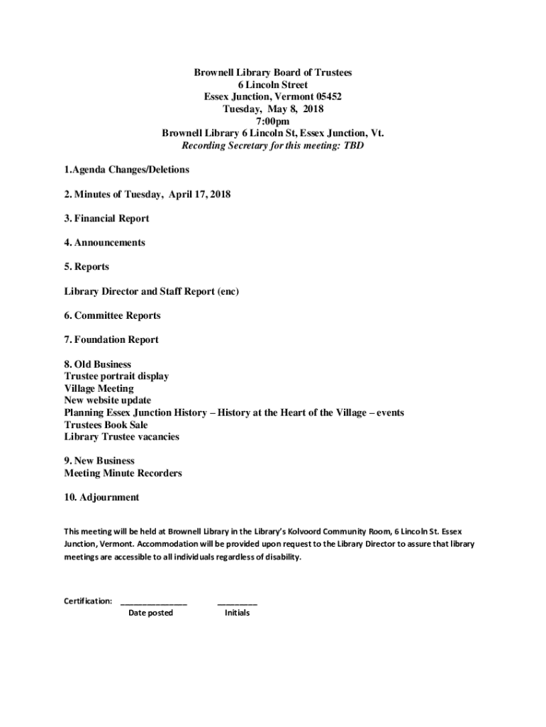 Brownell Library Board of Trustees 6 Lincoln Street Essex Junction, Vermont 05452 Tuesday, May 8, 2018 7:00pm Brownell Library 6 Lincoln St, Essex Junction, Vt. Recording Secretary for this meeting: