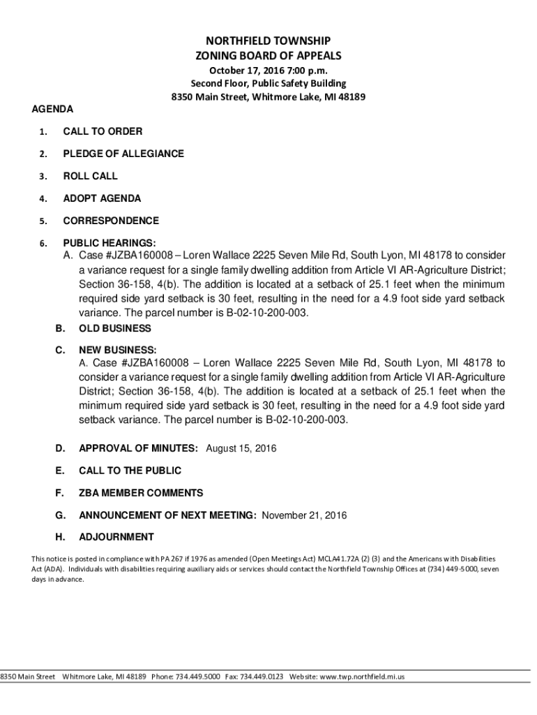 NORTHFIELD TOWNSHIP ZONING BOARD OF APPEALS October 17, 2016 7:00 p.m. Second Floor, Public Safety Building 8350 Main Street, Whitmore Lake, MI 48189 AGENDA 1.CALL TO ORDER2.PLEDGE OF ALLEGIANCE3.ROLL