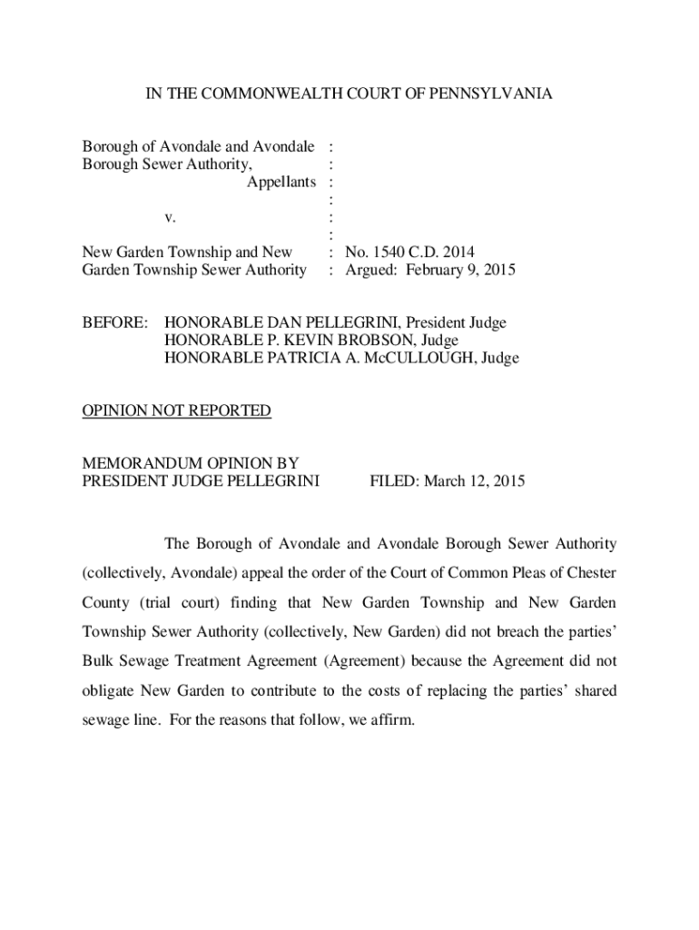 IN THE COMMONWEALTH COURT OF PENNSYLVANIA Borough of Avondale and Avondale : Borough Sewer Authority, : Appellants : : v. : : New Garden Township and New : No. 1540 C.D. 2014 Garden Township Sewer
