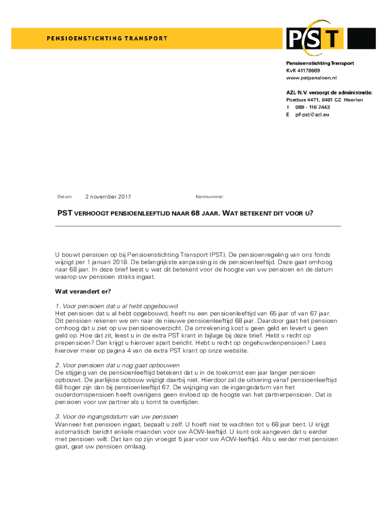 KIX Naam Straat Postcode PlaatsDatum:2 november 2017Klantnummer:150000000000001PST VERHOOGT PENSIOENLEEFTIJD NAAR 68 JAAR. WAT BETEKENT DIT VOOR U?Geachte aanhef, U bouwt pensioen op bij Pensioenstichting