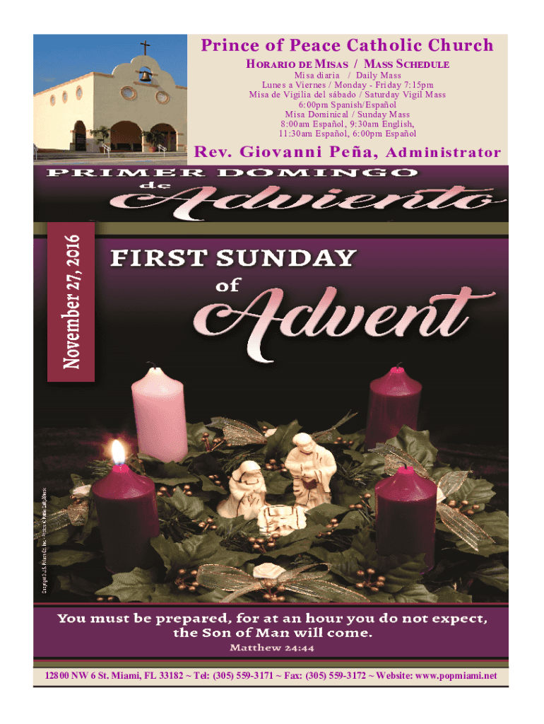 Prince of Peace Catholic Church HM/ MSMisa diaria / Daily Mass Lunes a Viernes / Monday Friday 7:15pm Misa de Vigilia del sbado / Saturday Vigil Mass 6:00pm Spanish/Espaol Misa Dominical / Sunday