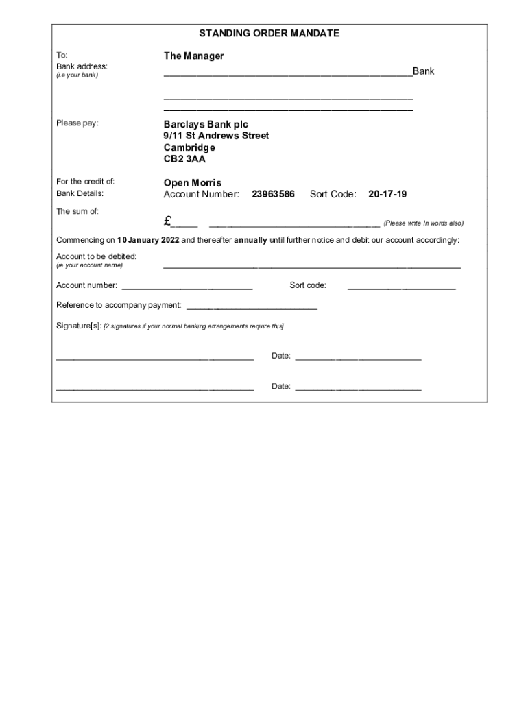 STANDING ORDER MANDATE To: Bank address: (i.e your bank)The Manager ___Bank ___ ___ ___Please pay:Barclays Bank plc 9/11 St Andrews Street Cambridge CB2 3AAFor the credit of: Bank Details:Open Morris