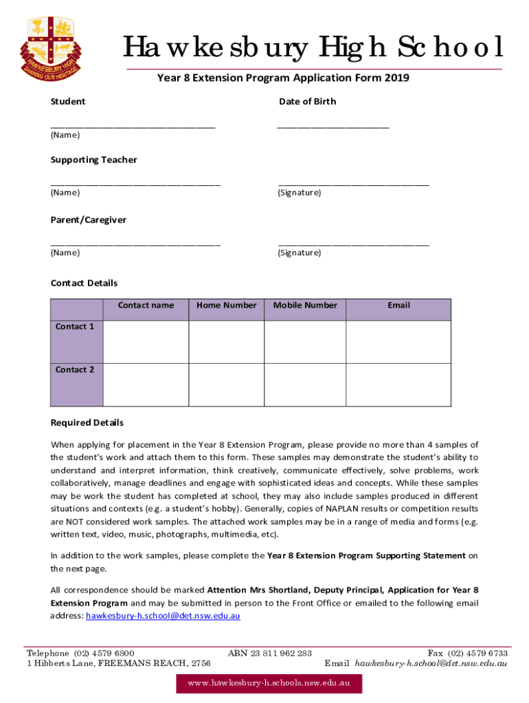 Hawkesbury High School Year 8 Extension Program Application Form 2019 StudentDate of Birth___ (Name)___Supporting Teacher ___ (Name)___ (Signature)Parent/Caregiver ___ (Name)___ (Signature)Contact
