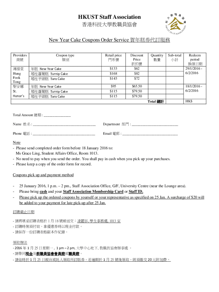 HKUST Staff Association New Year Cake Coupons Order Service Providers Hung Fook Tong St. HonorsCoupon type Retail price New Year Cake Turnip Cake Taro Cake$133 $168 $145Discount Price $62 $82 $72