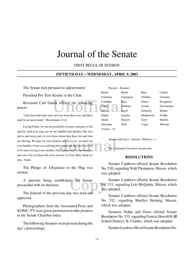 Journal of the Senate FIRST REGULAR SESSION FIFTIETH DAYWEDNESDAY, APRIL 9, 2003The Senate met pursuant to adjournment.PresentSenatorsPresident Pro Tem Kinder in the Chair.BartleBlandBrayCaskeyCauthornChampionChildersClemensDaysDolanDoughertyFosterGibbonsGoodeGriesheimerGrossJacobKennedyKinderKlindtLoudonMathewsonNodlerQuickRussellScottShieldsSteelmanStollVogelWheelerUnofficial