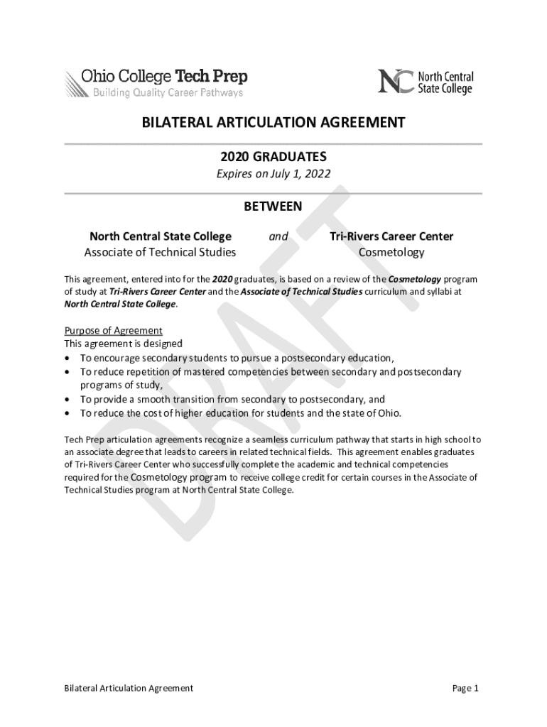 BILATERAL ARTICULATION AGREEMENT 2020 GRADUATESExpires on July 1, 2022BETWEEN North Central State College Associate of Technical StudiesandTriRivers Career Center CosmetologyThis agreement, entered