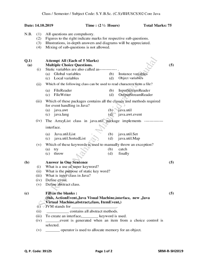 Class / Semester / Subject Code: S.Y.B.Sc. (C.S)/III/USCS302 Core Java Date: 14.10.2019 N.B.Time : (2 Hours)Total Marks: 75(1) (2) (3) (4)All questions are compulsory. Figures to the right indicate