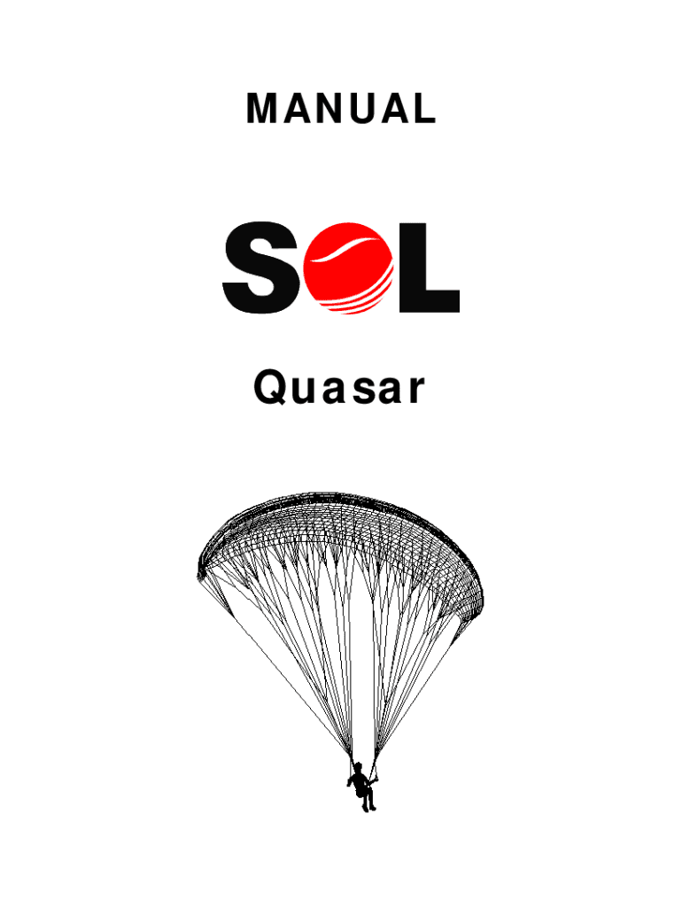 MANUALQuasarBEM VINDO A FAMLIA SOL! O SOL QUASAR produzido para toda Amrica sob licena da NOVA INTERNATIONAL. Ns damos parabns a voc pela compra do seu novo parapente e desejamos a voc muitas horas