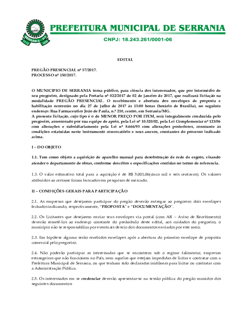 EDITAL PREGO PRESENCIAL n 57/2017. PROCESSO n 150/2017.O MUNICIPIO DE SERRANIA torna pblico, para cincia dos interessados, que por intermdio de seu pregoeiro, designado pela Portaria n 022/2017 de