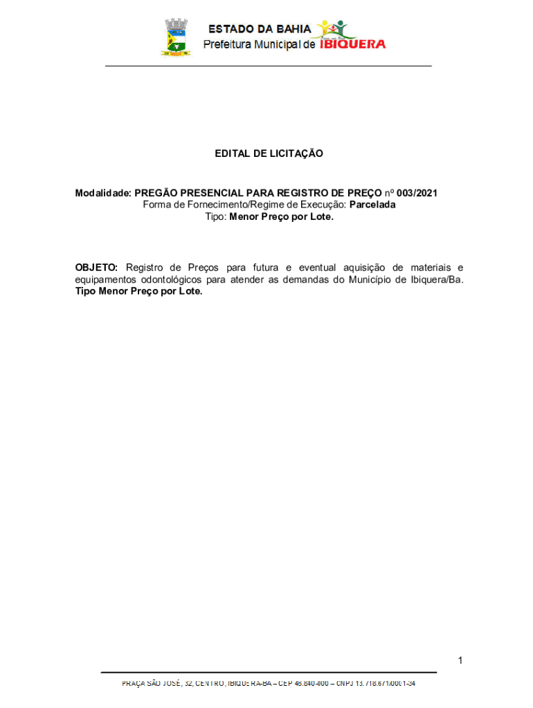 EDITAL DE LICITAOModalidade: PREGO PRESENCIAL PARA REGISTRO DE PREO n 003/2021 Forma de Fornecimento/Regime de Execuo: Parcelada Tipo: Menor Preo por Lote.OBJETO: Registro de Preos para futura e eventual