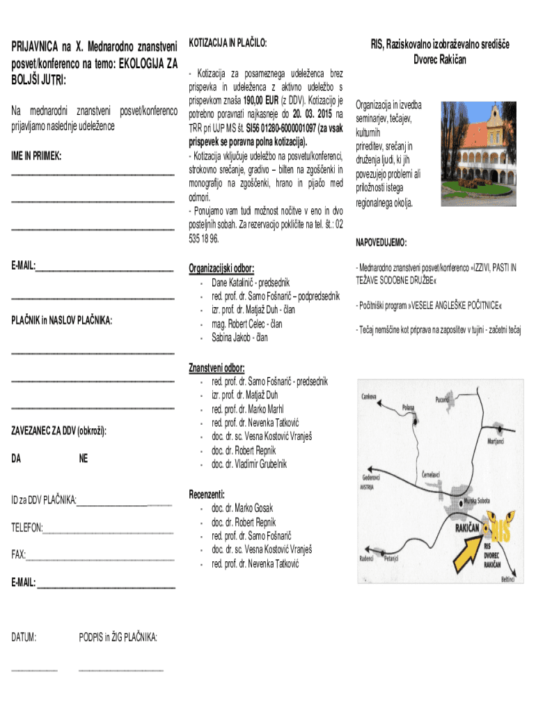 PRIJAVNICA na X. Mednarodno znanstveni posvet/konferenco na temo: EKOLOGIJA ZA BOLJI JUTRI: Na mednarodni znanstveni posvet/konferenco prijavljamo naslednje udeleence IME IN PRIIMEK: ___ ___ ___EMAIL:___