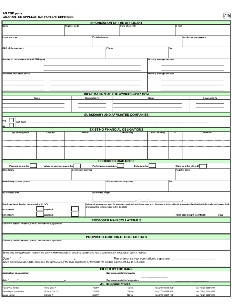 AS TBB pank GUARANTEE APPLICATION FOR ENTERPRISES INFORMATION OF THE APPLICANT NameRegister codeField of activityLegal addressEmailPostal addressCEO of the companyNumber of enmpoyeesPhoneFaxNumber
