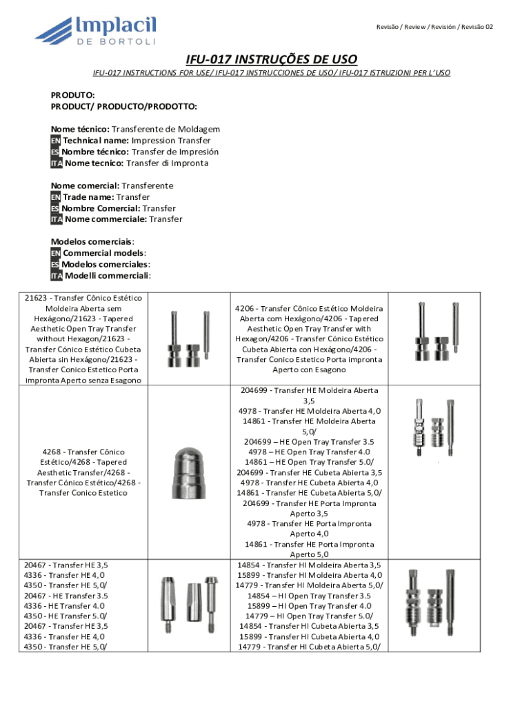 Reviso / Review / Revisin / Reviso 02IFU017 INSTRUES DE USO IFU017 INSTRUCTIONS FOR USE/ IFU017 INSTRUCCIONES DE USO/ IFU017 ISTRUZIONI PER LUSOPRODUTO: PRODUCT/ PRODUCTO/PRODOTTO: Nome tcnico: Transferente