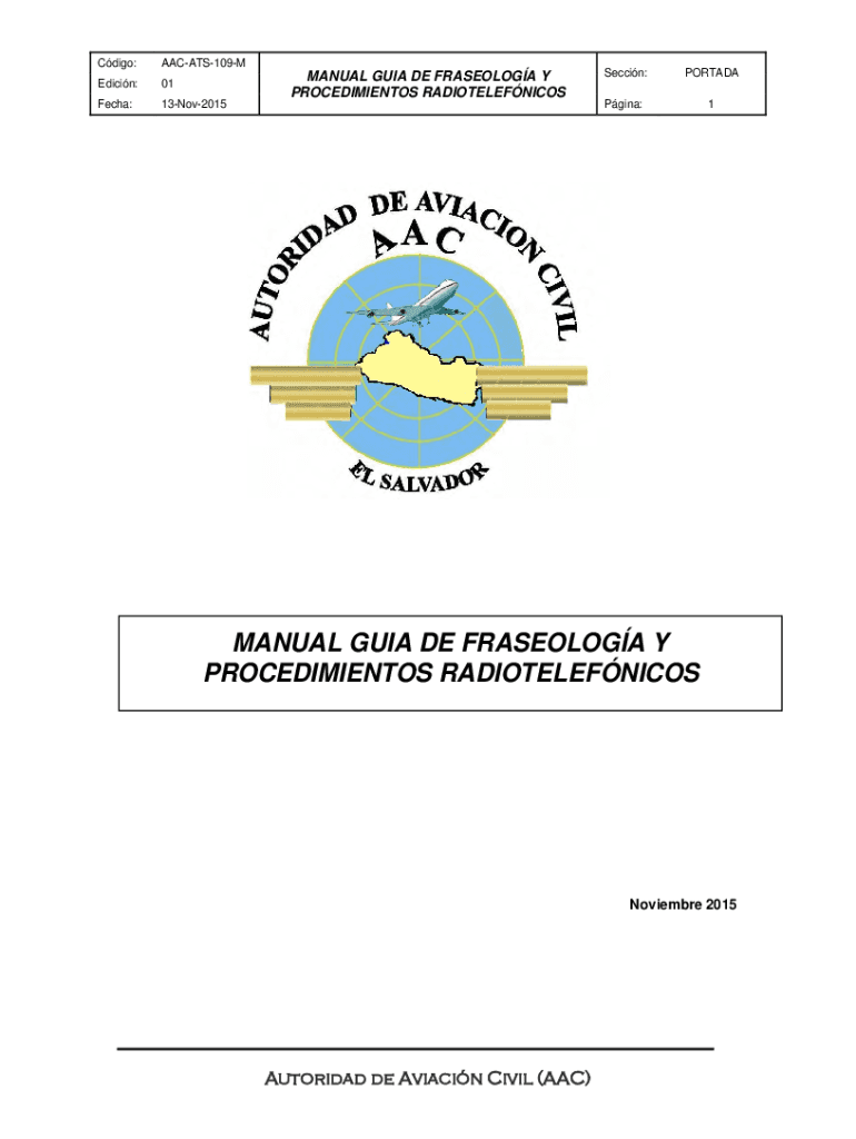 Cdigo:AACATS109MEdicin:01Fecha:13Nov2015MANUAL GUIA DE FRASEOLOGA Y PROCEDIMIENTOS RADIOTELEFNICOSSeccin:PORTADAPgina:1MANUAL GUIA DE FRASEOLOGA Y PROCEDIMIENTOS RADIOTELEFNICOSNoviembre 2015Autoridad