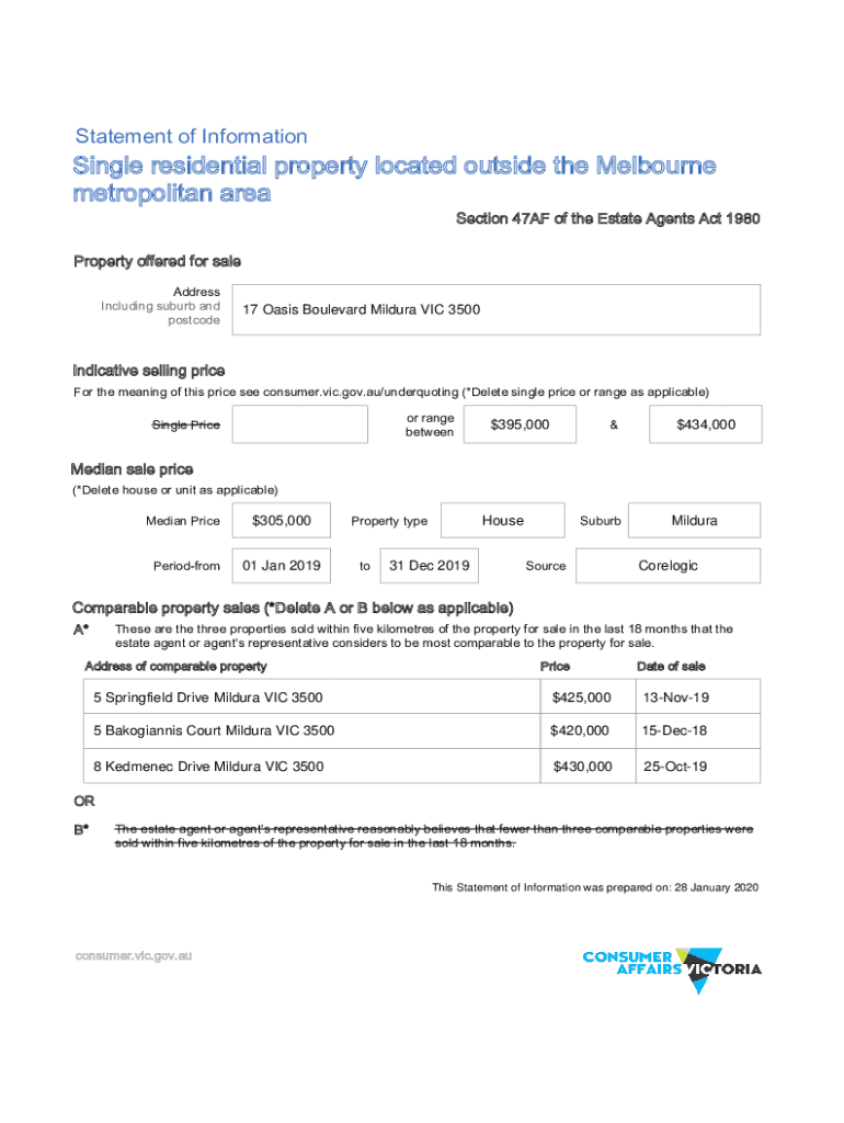 Statement of InformationSingle residential property located outside the Melbourne metropolitan area Section 47AF of the Estate Agents Act 1980 Property offered for sale Address Including suburb and