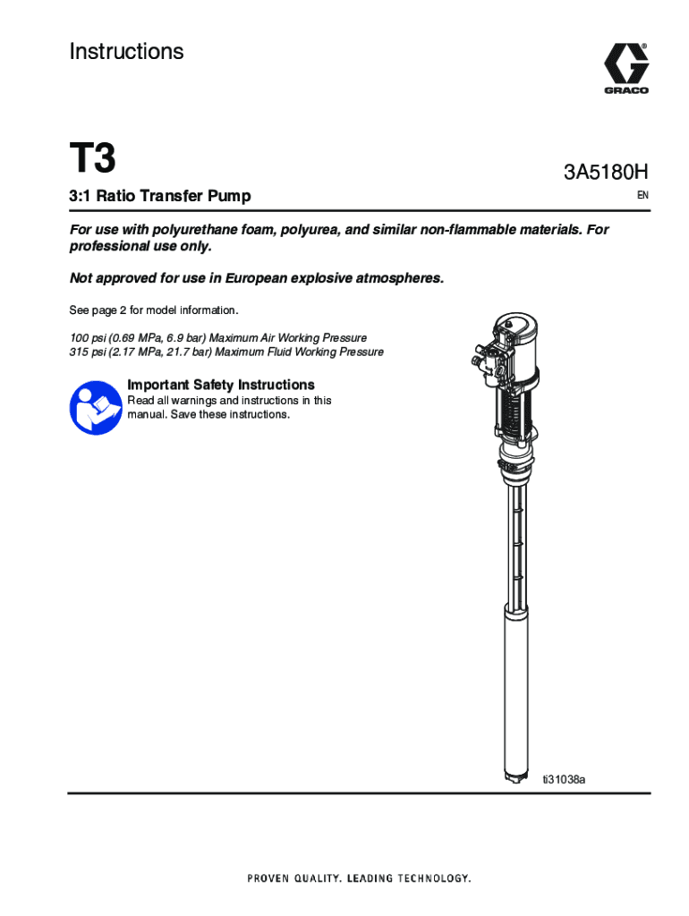 InstructionsT33A5180H3:1 Ratio Transfer PumpENFor use with polyurethane foam, polyurea, and similar nonflammable materials. For