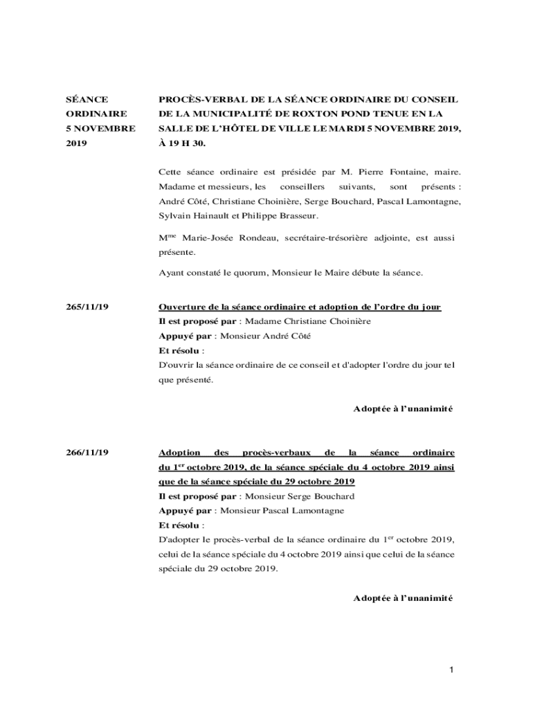 SANCEPROCSVERBAL DE LA SANCE ORDINAIRE DU CONSEILORDINAIREDE LA MUNICIPALIT DE ROXTON POND TENUE EN LA5 NOVEMBRESALLE DE LHTEL DE VILLE LE MARDI 5 NOVEMBRE 2019,2019 19 H 30.Cette sance ordinaire