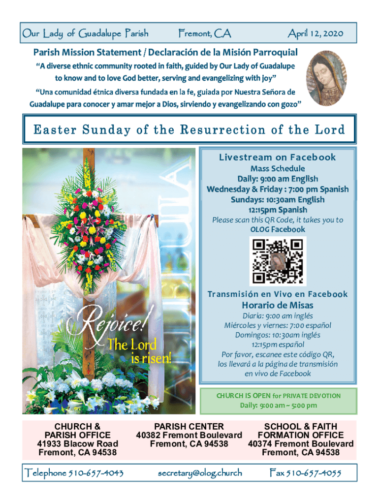 Our Lady of Guadalupe ParishFremont, CAApril 12, 2020Parish Mission Statement / Declaracin de la Misin ParroquialLivestream on Facebook Mass Schedule Daily: 9:00 am English Wednesday & Friday : 7:00