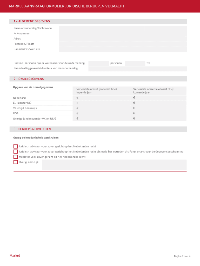 MarkelAanvraagformulier Juridische Beroepen VolmachtMarkelPagina 1 van 4MARKEL AANVRAAGFORMULIER JURIDISCHE BEROEPEN VOLMACHTPersoonsgegevens/UBO De bij de aanvraag of wijziging van de verzekering
