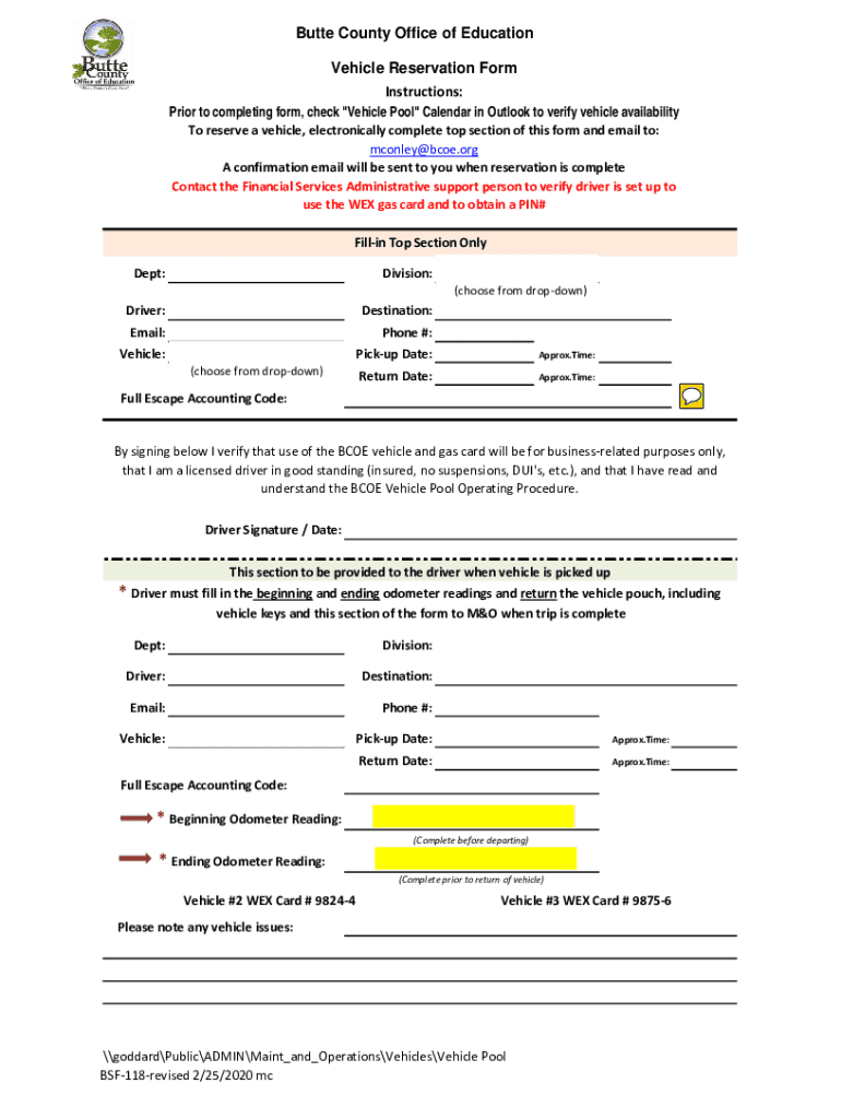 The BSF-118 vehicle reservation form must report information such as reservation date, vehicle type, intended use, duration of reservation, and requester’s contact details.
