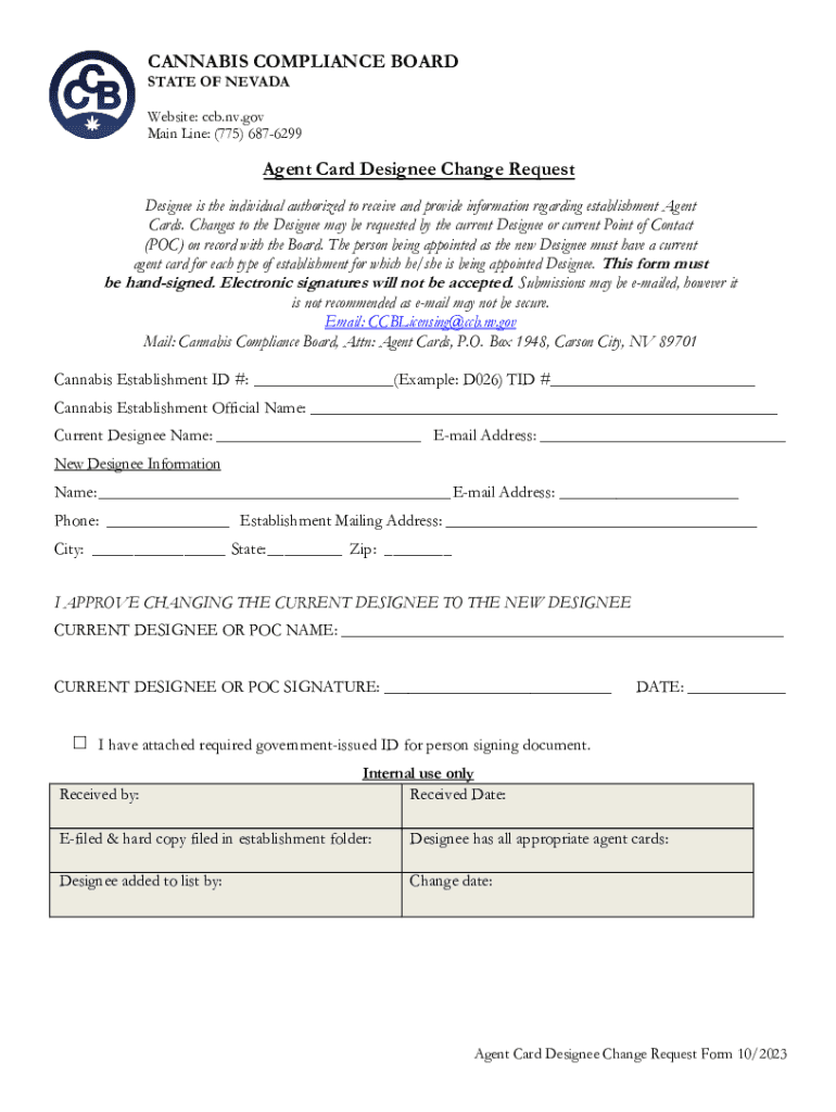 CANNABIS COMPLIANCE BOARD STATE OF NEVADAWebsite: ccb.nv.gov Main Line: (775) 6876299Agent Card Designee Change Request Designee is the individual authorized to receive and provide information regarding
