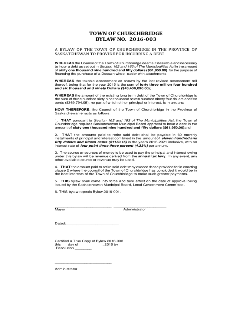 TOWN OF CHURCHBRIDGE BYLAW NO. 2016003 A BYLAW OF THE TOWN OF CHURCHBRIDGE IN THE PROVINCE OF SASKATCHEWAN TO PROVIDE FOR INCURRING A DEBT WHEREAS the Council of the Town of Churchbridge deems it