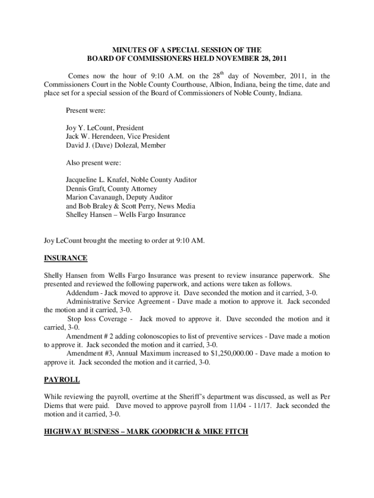 MINUTES OF A SPECIAL SESSION OF THE BOARD OF COMMISSIONERS HELD NOVEMBER 28, 2011 Comes now the hour of 9:10 A.M. on the 28th day of November, 2011, in the Commissioners Court in the Noble County
