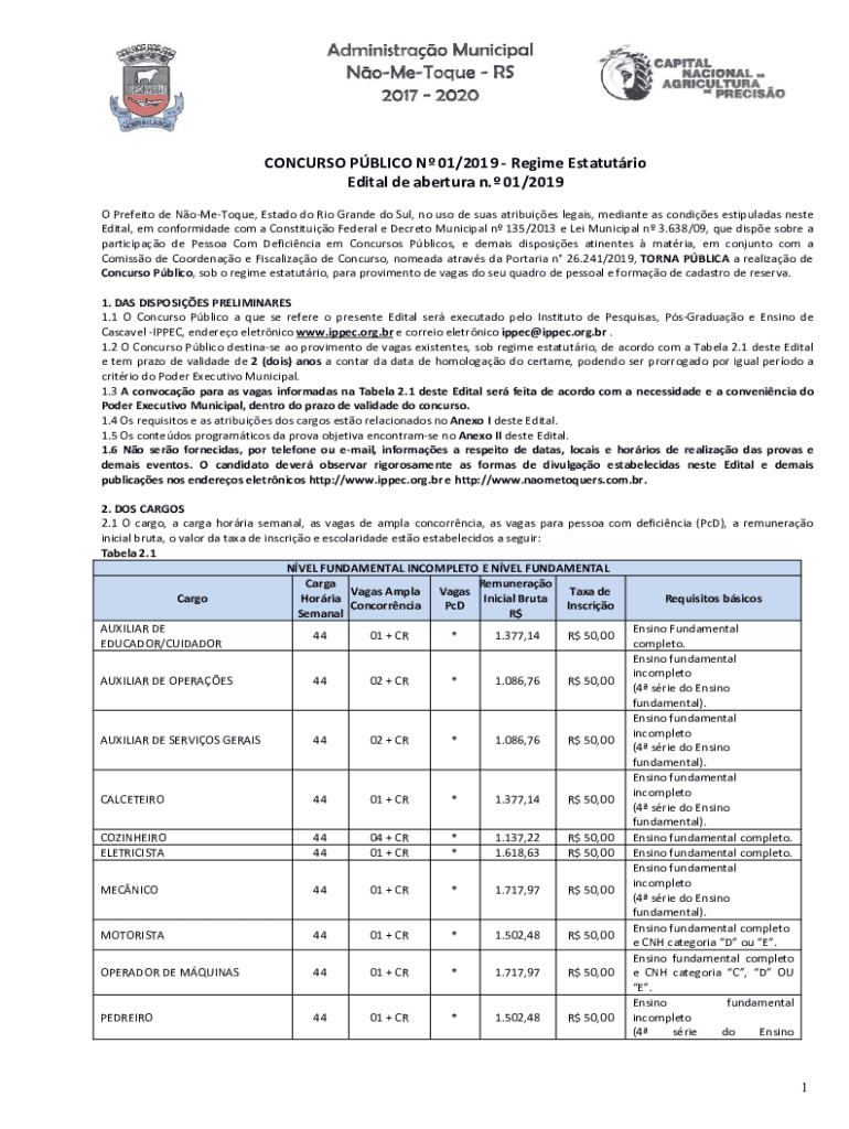 CONCURSO PBLICO N 01/2019 Regime Estatutrio Edital de abertura n. 01/2019 O Prefeito de NoMeToque, Estado do Rio Grande do Sul, no uso de suas atribuies legais, mediante as condies estipuladas neste