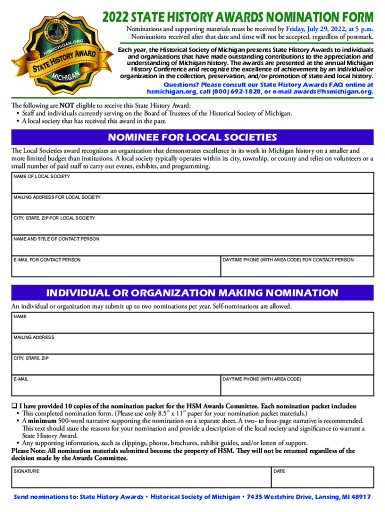 2022 STATE HISTORY AWARDS NOMINATION FORM Nominations and supporting materials must be received by Friday, July 29, 2022, at 5 p.m. Nominations received after that date and time will not be accepted,