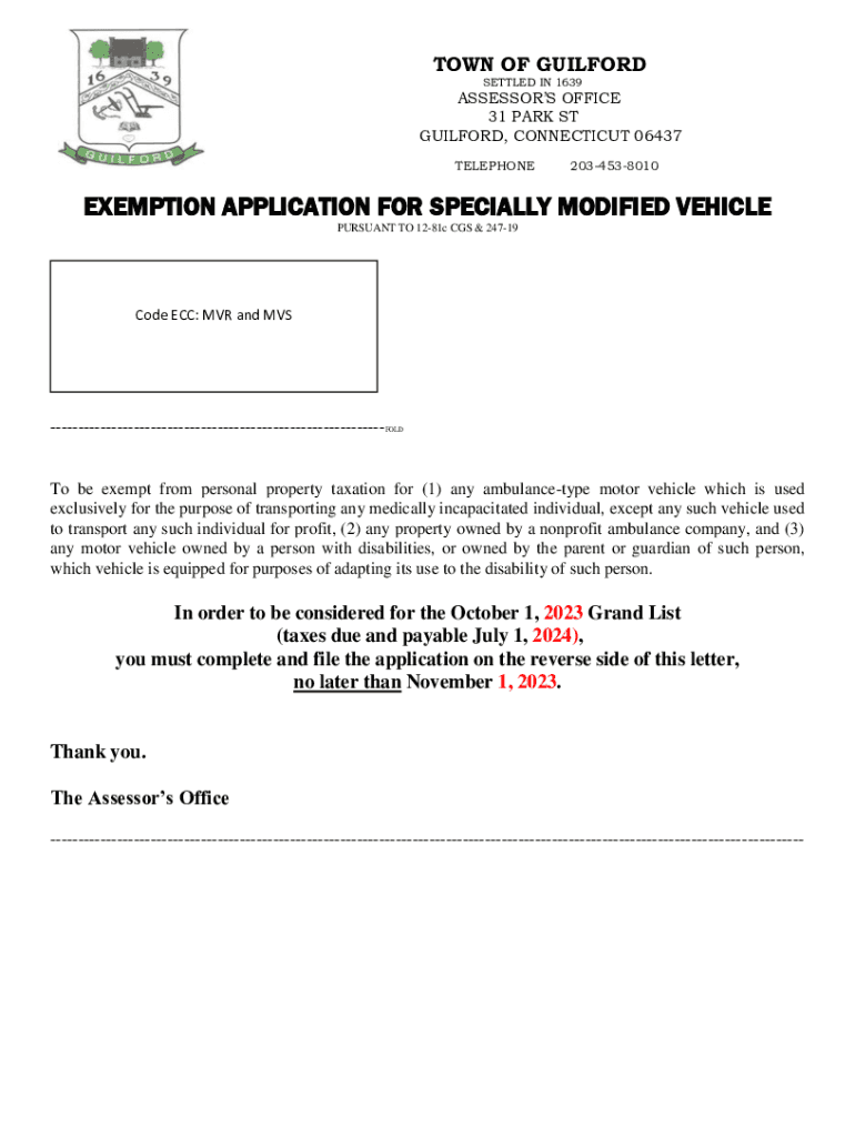 TOWN OF GUILFORD SETTLED IN 1639ASSESSORS OFFICE 31 PARK ST GUILFORD, CONNECTICUT 06437 TELEPHONE2034538010EXEMPTION APPLICATION FOR SPECIALLY MODIFIED VEHICLE PURSUANT TO 1281c CGS & 24719Code ECC: