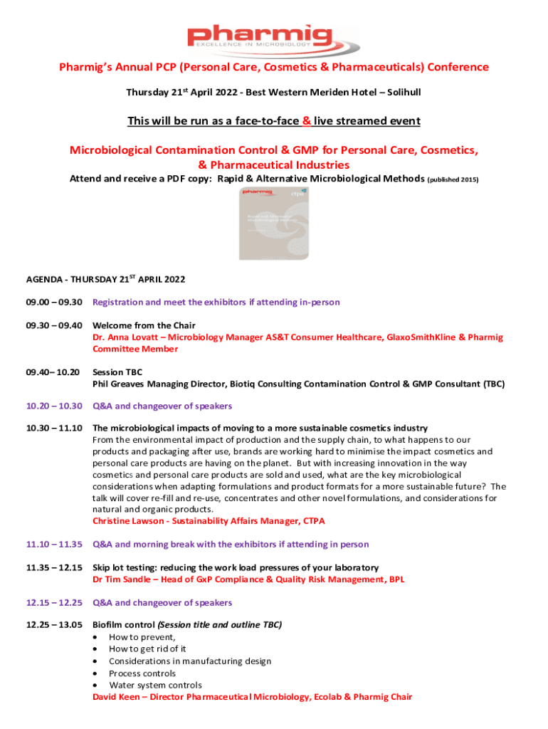 Pharmigs Annual PCP (Personal Care, Cosmetics & Pharmaceuticals) Conference Thursday 21st April 2022 Best Western Meriden Hotel SolihullThis will be run as a facetoface & live streamed event Microbiological