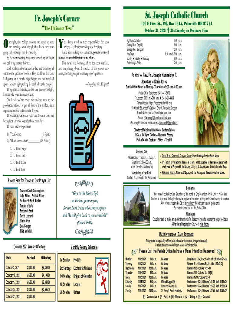 St. Joseph Catholic ChurchFr. Josephs Corner150 E First St., P.O. Box 1315, Prineville OR 97754 October 31, 2021 31st Sunday in Ordinary TimeThe Ultimate TestOne night, four college students had stayed
