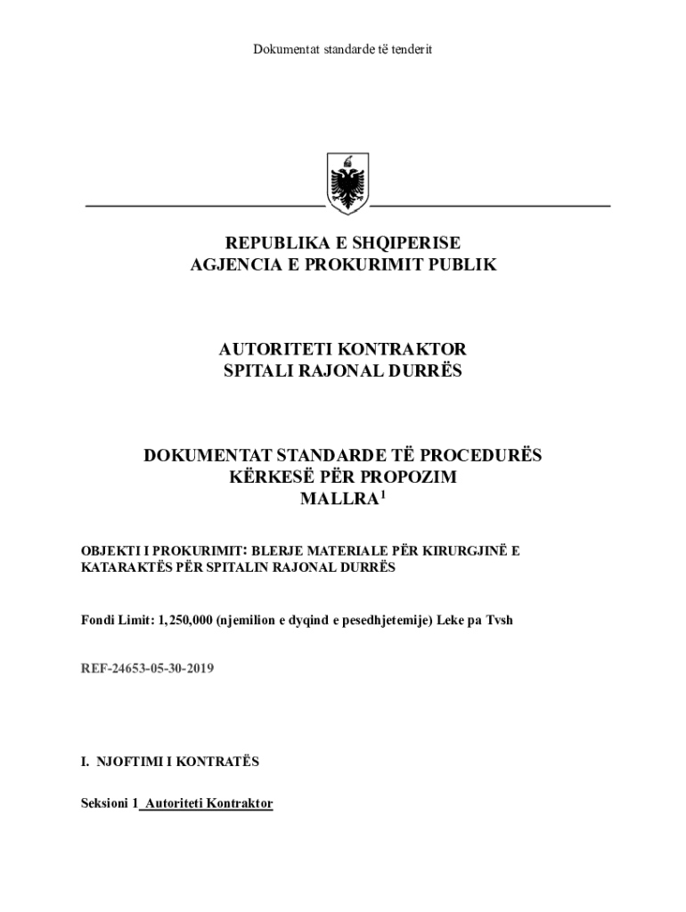 Dokumentat standarde t tenderitREPUBLIKA E SHQIPERISE AGJENCIA E PROKURIMIT PUBLIKAUTORITETI KONTRAKTOR SPITALI RAJONAL DURRSDOKUMENTAT STANDARDE T PROCEDURS KRKES PR PROPOZIM MALLRA1 OBJEKTI I PROKURIMIT: