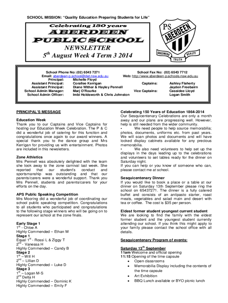SCHOOL MISSION: Quality Education Preparing Students for LifeCelebrating 150 yearsABERDEEN PUBLIC SCHOOL NEWSLETTER 5 August Week 4 Term 3 2014 thSchool Phone No: (02) 6543 7271 School Fax No: (02)