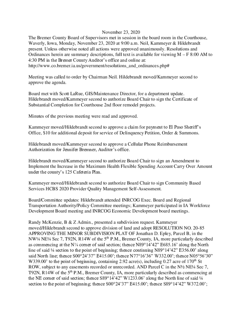 November 23, 2020 The Bremer County Board of Supervisors met in session in the board room in the Courthouse, Waverly, Iowa, Monday, November 23, 2020 at 9:00 a.m. Neil, Kammeyer & Hildebrandt present.