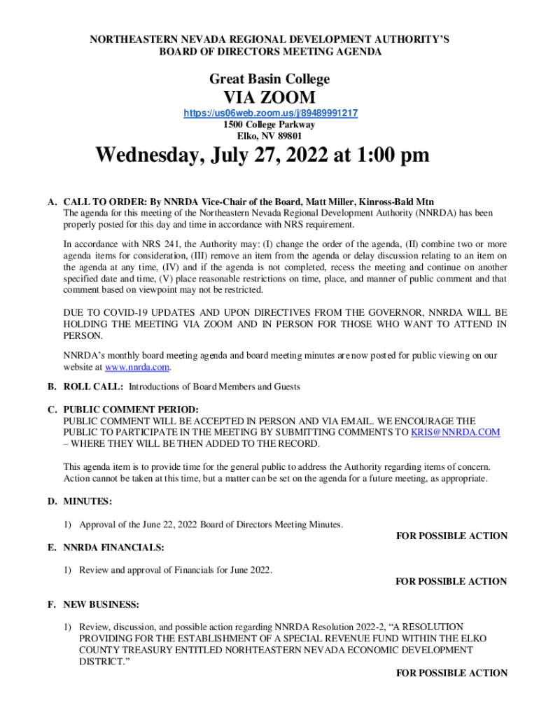 NORTHEASTERN NEVADA REGIONAL DEVELOPMENT AUTHORITYS BOARD OF DIRECTORS MEETING AGENDAGreat Basin CollegeVIA ZOOM https://us06web.zoom.us/j/89489991217 1500 College Parkway Elko, NV 89801Wednesday,
