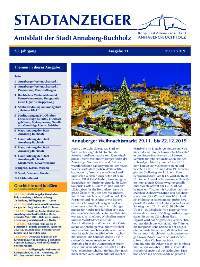 STADTANZEIGER Amtsblatt der Stadt AnnabergBuchholz 28. JahrgangAusgabe 1129.11.2019Themen in dieser Ausgabe Seite 1 Annaberger Weihnachtsmarkt ___ 2 Annaberger Weihnachtsmarkt: Programme, Veranstaltungen