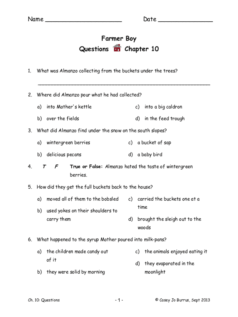 Print Use your Browser Back to Return to Previous PageName ___Date ___Farmer Boy Questions 1.Chapter 10What was Almanzo collecting from the buckets under the trees? ___2.3.Where did Almanzo pour what
