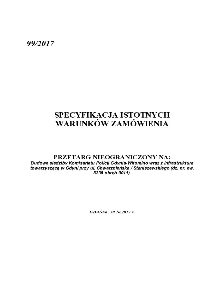 99/2017SPECYFIKACJA ISTOTNYCH WARUNKW ZAMWIENIAPRZETARG NIEOGRANICZONY NA: Budow siedziby Komisariatu Policji GdyniaWitomino wraz z infrastruktur towarzyszc w Gdyni przy ul. Chwarznieska / Staniszewskiego